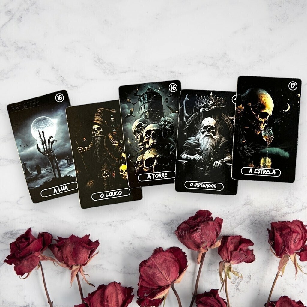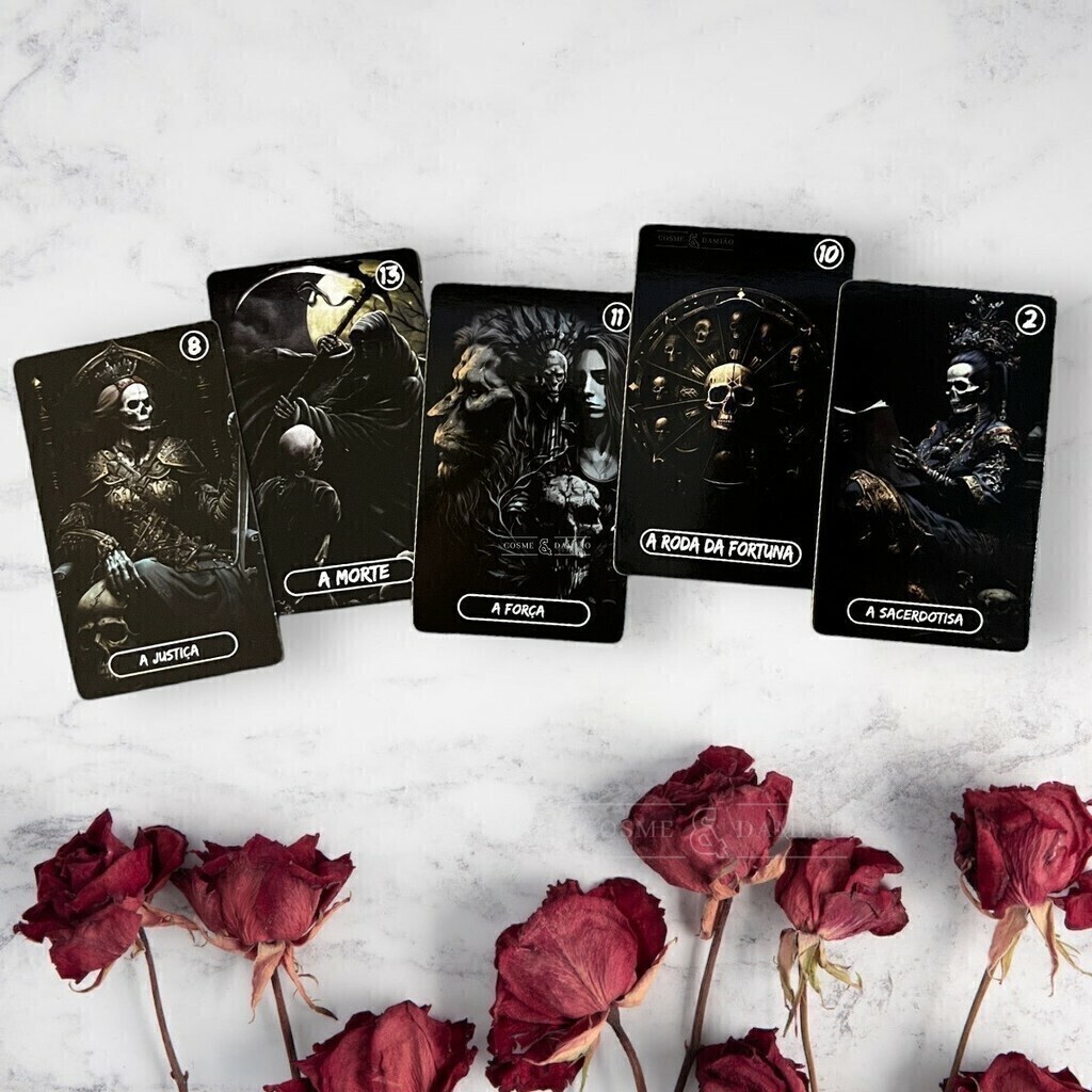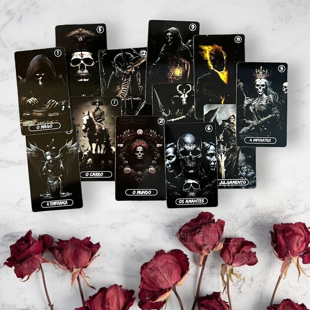 ? Design Lendário e Misterioso: As cartas apresentam ilustrações sombrias e poderosas, evocando uma atmosfera mística e enigmática que conecta você com o lado oculto e ancestral do Tarô.